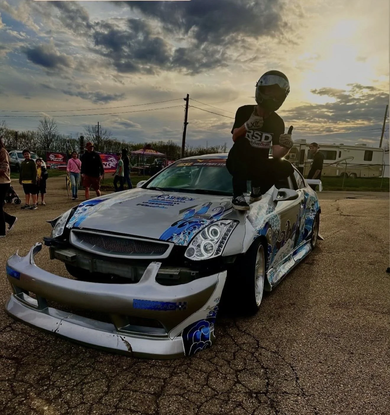 Bought in 2022 broken on the side of the road with a bonded, salvaged and out of state title she was in bad shape. After replacing the trans, fixing the torn out subframe mounts, some much needed maintance, and jumping through the hoops at the DMV she was revived. She sat like that for quite a while, some small things here and there but still looking the same. When the boys said they needed me for the SXD challenge that’s when I knew it was time to get serious. Within 2 months she got painted, bucket seat, homemade angle kit, new diff, clutch, and a full livery. My idea with this car is to make a very well set up street car but still be competitive. Full interior, heat and ac, working cruise control, and last but not least a good sound system are all mandatory.